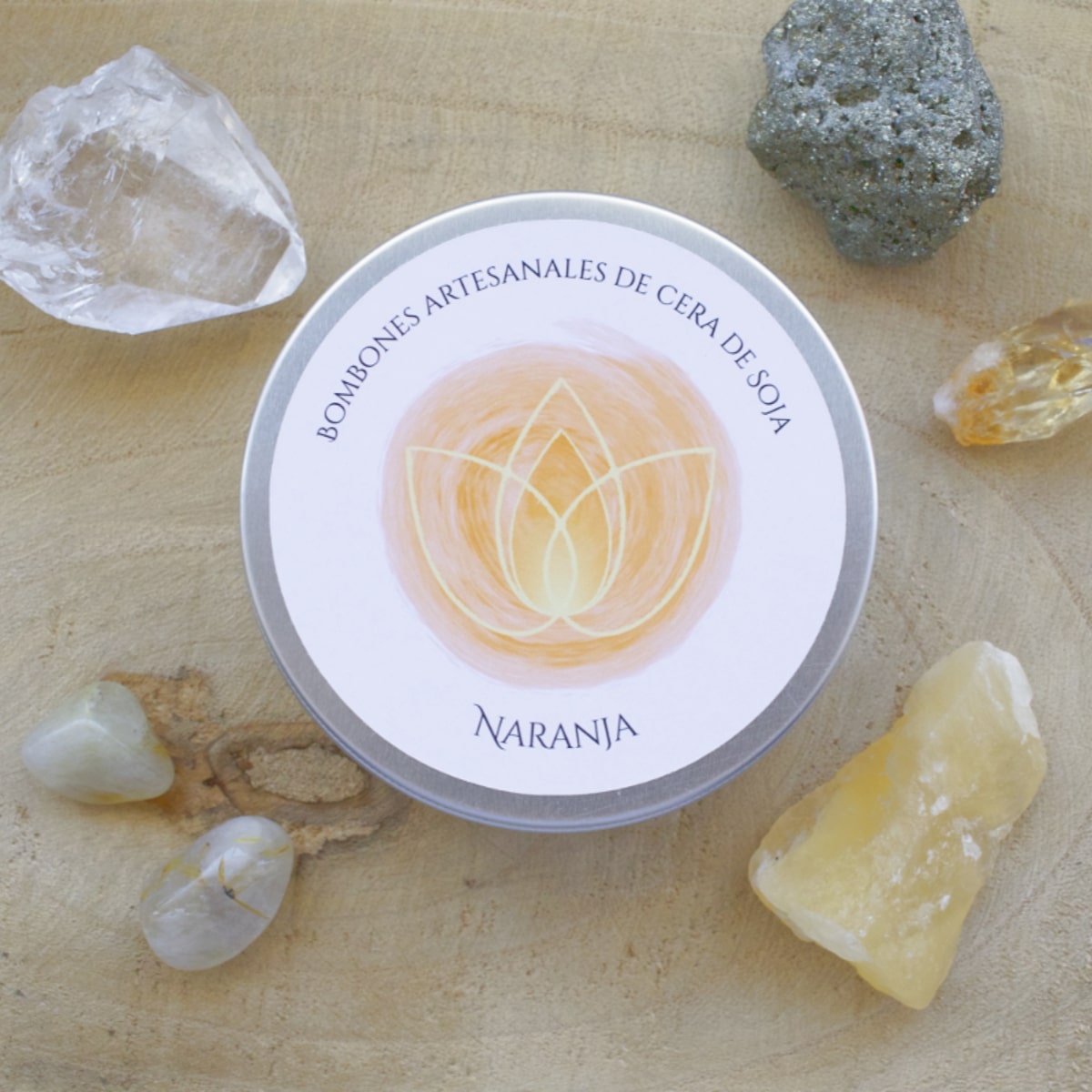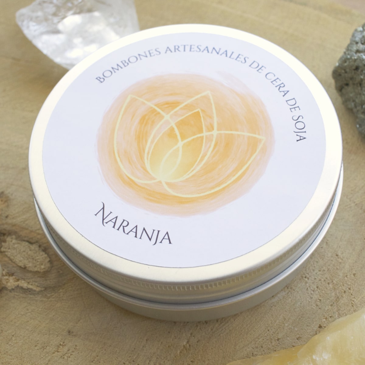 Mini melts de cera de soja ecológica y aceite esencial de Naranja 100% puro y natural en lata de aluminio.