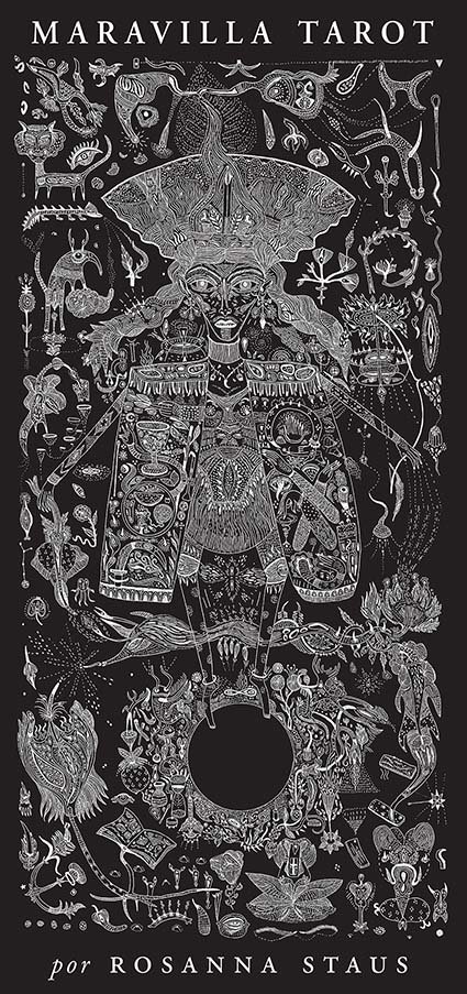 Mucho antes de que las cartas del Tarot sirviesen para despertar fuerzas ocultas, los mazos se entendían, sencillamente, como obras de arte para disfrutar durante el juego. La artista alemana Rosana Staus recupera esta simbología original en Maravilla Tarot, una obra gráficamente deslumbrante, donde el arte y la poesía se entrelazan para reimaginar y resignificar el sentido de las cartas de este popular juego nacido en el siglo xiv. Staus utiliza la técnica del grabado, de finas líneas negras sobre blanco, creando ilustraciones polisémicas, para reinterpretar las setenta y ocho cartas del Tarot. Las criaturas y personajes del mazo, como la Curandera, los Enamorados, el Sol o la Luna, conviven en este mundo onírico que se aleja de su significado esotérico para entenderse como un juego artístico y literario. Julius Müller-Bernstein acompaña los veintidós triunfos y las cuatro familias del Tarot con aforismos poéticos.